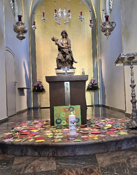 In der Marienkapelle legten die Kinder selbst gebastelte Blumen auf die Stufen vor der Muttergottes ab und zogen weiter in die Clemenskirche. Dort fand ein gemeinsamer Gottesdienst statt, in dem eine Geschichte über Maria erzählt und fröhliche Lieder gesungen wurden.